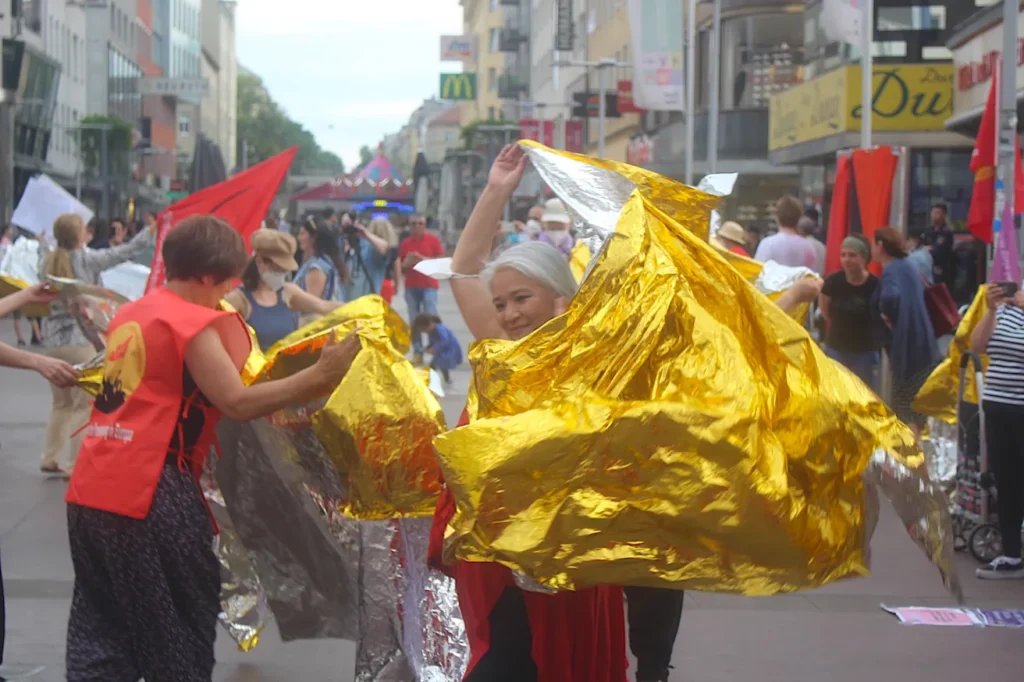 Mit einer Rede und der Performance mit den goldenen Rettungsdecken mit dem Song „Systemrelevant“ von Judith Klemenc für Mehr für CARE!.