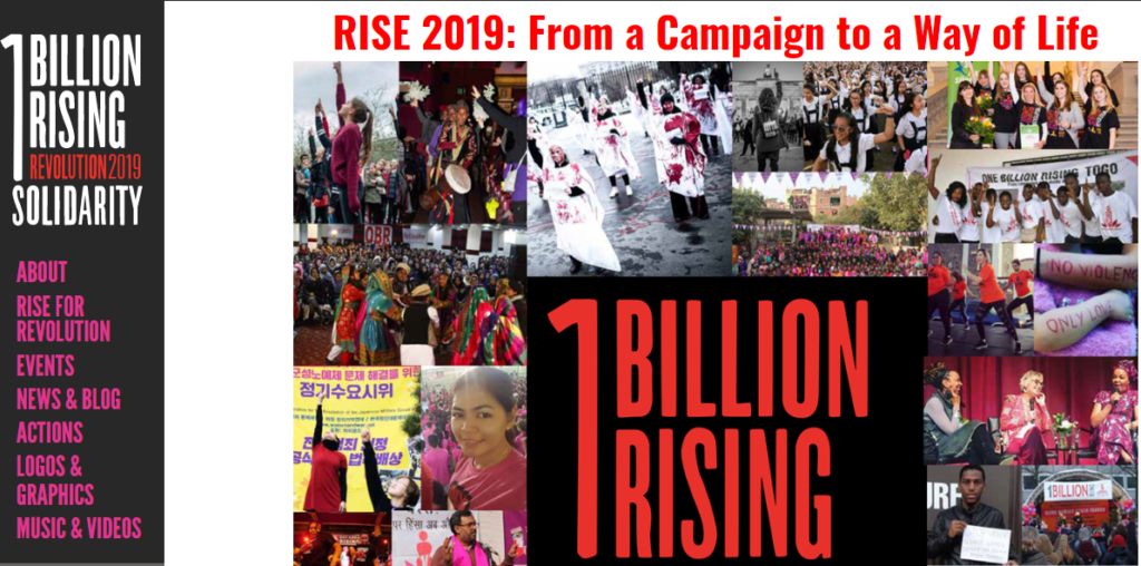 Auf der Webseite von One Billion Rising International ist OBRA sehr präsent. Ende Mai trifft Aiko die Gründerin von One Billion Rising, Eve Ensler, in London. – www.onebillionrising.org – Screenshot am 24. Mai 2019